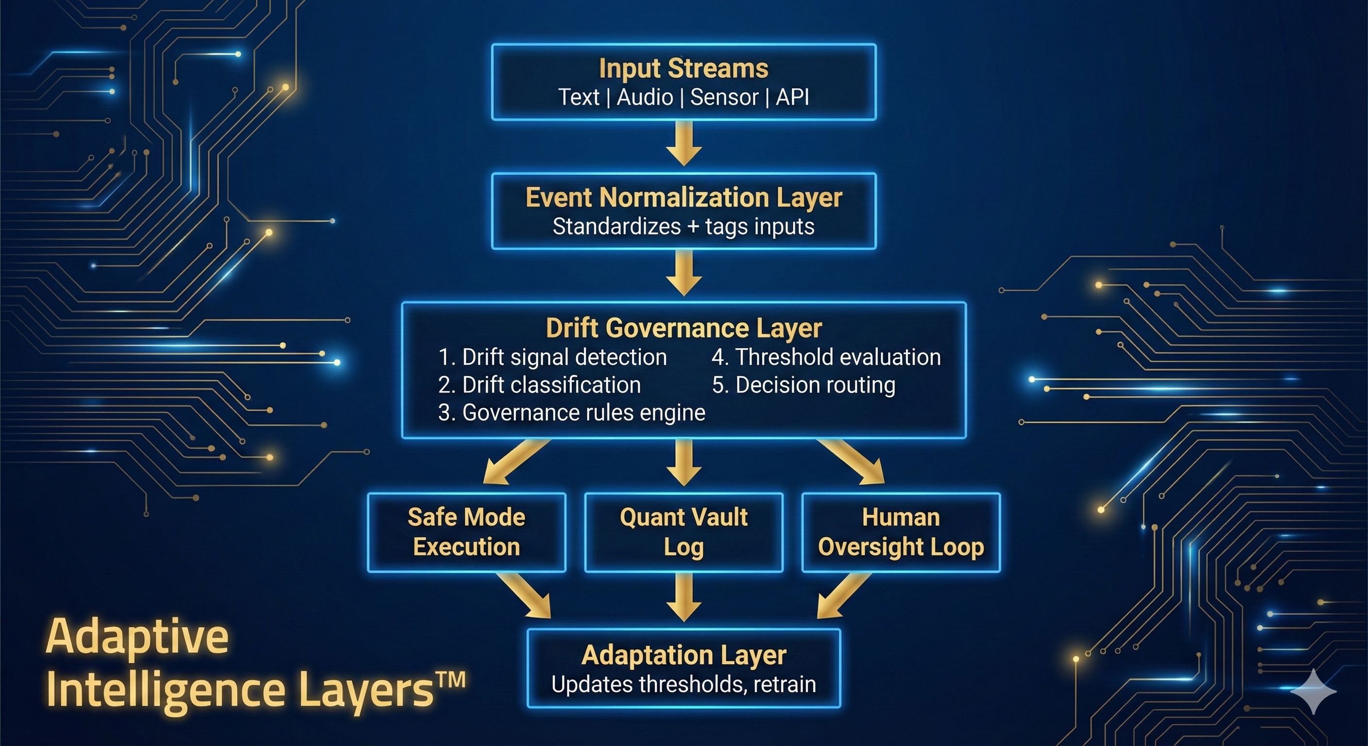 Adaptive Intelligence Layers™ – Drift Governance architecture. Event normalization flows into the Governance Layer, which controls Safe Mode Execution, Quant Vault logging, Human Oversight, and the Adaptation Layer.